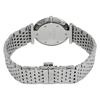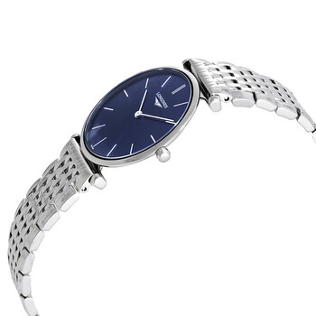 Stainless steel case with stainless steel bracelet. Fixed stainless steel bezel. Blue dial with silver-tone hands and index hour markers. Dial Type: Analog. Longines calibre L420 quartz movement. Scratch resistant sapphire crystal. Pull / push crown. Solid case back. Round case shape. Case size: 29 mm. Case thickness: 5 mm. Band width: 16 mm. Butterfly clasp. Water resistant at 30 meters / 100 feet. Functions: hour, minute. La Grande Classique De Longines Series. Casual watch style. Watch label: Swiss Made. Longines La Grande Classique Blue Dial Ladies Watch L45124956.