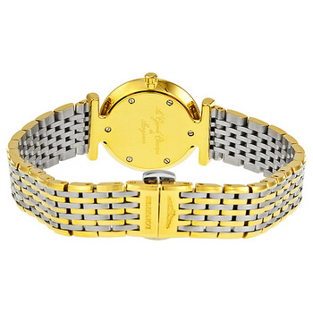 Stainless steel case with a two-tone (silver and 18kt gold-plated) stainless steel bracelet. Fixed 18kt gold-plated bezel. Champagne dial with black hands and index hour markers. Dial Type: Analog. Quartz movement. Scratch resistant sapphire crystal. Solid case back. Case diameter: 24.5 mm. Case thickness: 5 mm. Round case shape. Band length: 6 inches. Deployment clasp. Water resistant at 30 meters / 100 feet. Functions: hour, minute. Casual watch style. Longines La Grande Classique Champagne Dial Two-tone Ladies Watch L42092427.