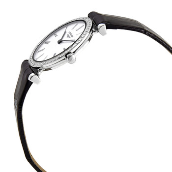 Stainless steel case with a black (alligator) leather strap. Fixed stainless steel bezel set with 48 diamonds. White dial with silver-tone hands and Roman numeral hour markers. Dial Type: Analog. Longines calibre L209 quartz movement. Scratch resistant sapphire crystal. Pull / push crown. Solid case back. Round case shape. Case size: 24 mm. Case thickness: 4.4 mm. Band width: 13 mm. Tang clasp. Water resistant at 30 meters / 100 feet. Functions: hour, minute. Additional Info: Case set with 48 Wesselton vvs diamonds, for a total of 0.403 carats. La Grande Classique Series. Dress watch style. Watch label: Swiss Made. Item Variations: L4.241.0.11.2. Longines La Grande Classique Diamond Ladies Watch L4.241.0.11.2.