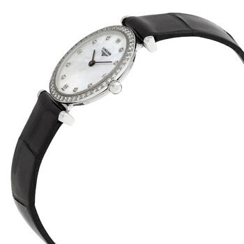 Stainless steel case with a black (alligator) leather strap. Fixed stainless steel bezel set with 48 diamonds. White mother of pearl dial with black hands. Diamond. Dial Type: Analog. Longines calibre L209 quartz movement. Scratch resistant sapphire crystal. Pull / push crown. Solid case back. Round case shape. Case size: 24 mm. Band width: 13 mm. Tang clasp. Water resistant at 30 meters / 100 feet. Functions: hour, minute. Additional Info: dial: 12 diamond set 0.034ct. bezel: 48 diamond set 0.48ct. La Grande Classique Series. Dress watch style. Watch label: Swiss Made. Longines La Grande Classique Mother of Pearl Diamond Ladies Watch L4.241.0.80.2.