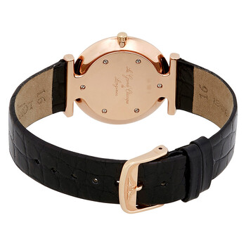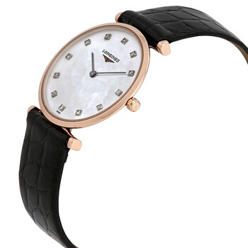 Rose gold-plated stainless steel case with a black leather strap. Fixed rose gold-plated bezel. Mother of pearl dial with black-tone hands and diamond hour markers. Dial Type: Analog. Quartz movement. Scratch resistant sapphire crystal. Pull / push crown. Solid case back. Case size: 29 mm. Round case shape. Band width: 16 mm. Tang clasp. Water resistant at 30 meters / 100 feet. Functions: hour, minute. Dress watch style. Watch label: Swiss Made. Item Variations: L4.512.1.97.2. Longines La Grande Classique Mother of Pearl Diamond Ladies Watch L45121972.