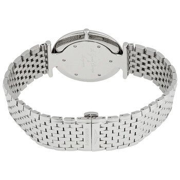 Stainless steel case with a stainless steel bracelet. Fixed stainless steel bezel. Blue dial with silver-tone hands and Roman numeral hour markers. Dial Type: Analog. Longines calibre L420 quartz movement. Scratch resistant sapphire crystal. Pull / push crown. Solid case back. Round case shape. Case size: 36 mm. Bracelet width: 20 mm. Fold over clasp with a push button release. Water resistant at 30 meters / 100 feet. Functions: hour, minute. La Grande Classique Series. Casual watch style. Watch label: Swiss Made. Longines La Grande Classique Quartz Blue Dial Ladies Watch L4.755.4.94.6.