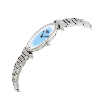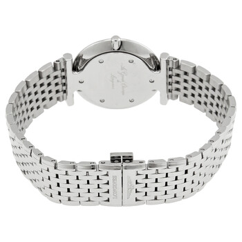 Stainless steel case with a stainless steel bracelet. Fixed stainless steel bezel. Mother of pearl dial with black hands. No markers. Dial Type: Analog. Longines Calibre L420 quartz movement. Scratch resistant sapphire crystal. Pull / push crown. Solid case back. Round case shape. Case size: 29 mm. Case thickness: 4.2 mm. Deployment clasp. Water resistant at 30 meters / 100 feet. Functions: hour, minute. La Grande Classique Series. Dress watch style. Watch label: Swiss Made. Longines La Grande Classique Quartz Blue Star Mother of Pearl Dial Ladies Watch L4.512.4.03.6.
