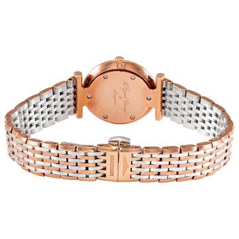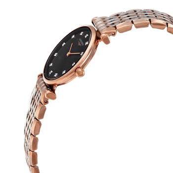 Rose gold PVD stainless steel case with a two-tone (silver-tone and rose gold PVD) stainless steel bracelet. Fixed rose gold PVD bezel. Black lacquered dial with rose gold-tone hands and diamond hour markers. Dial Type: Analog. Longines calibre L209 quartz movement. Scratch resistant sapphire crystal. Pull / push crown. Solid case back. Round case shape. Case size: 24 mm. Case thickness: 4.3 mm. Band width: 13 mm. Fold over clasp with a push button release. Water resistant at 30 meters / 100 feet. Functions: hour, minute. La Grande Classique Series. Dress watch style. Watch label: Swiss Made. Longines La Grande Classique Quartz Diamond Black Dial Ladies Watch L4.209.1.57.7.