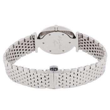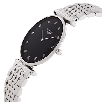 Silver-tone stainless steel case and bracelet. Fixed bezel. Black dial with silver-tone hands and diamond hour markers. Dial Type: Analog. Quartz movement. Scratch resistant sapphire crystal. Pull / push crown. Solid case back. Round case shape, case size: 33 mm, case thickness: 5 mm. Hidden folding clasp. Water resistant at 30 meters / 99 feet. Functions: hour, minute. La Grande Classique Series. Dress watch style. Watch label: Swiss Made. Longines La Grande Classique Quartz Diamond Black Dial Ladies Watch L4.709.4.55.6.