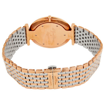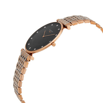 Rose gold PVD stainless steel case with a two-tone (silver-tone and rose gold PVD) stainless steel bracelet. Fixed rose gold PVD bezel. Black dial with rose gold-tone hands and diamond hour markers. Dial Type: Analog. Quartz movement. Scratch resistant sapphire crystal. Pull / push crown. Solid case back. Round case shape. Case size: 37 mm. Case thickness: 5 mm. Band width: 20 mm. Hidden fold over clasp. Water resistant at 30 meters / 99 feet. Functions: hour, minute. La Grande Classique Series. Dress watch style. Watch label: Swiss Made. Longines La Grande Classique Quartz Diamond Black Dial Men's Watch L47661577.