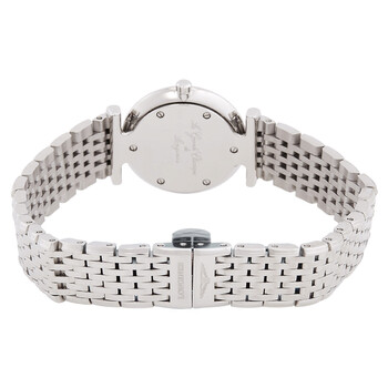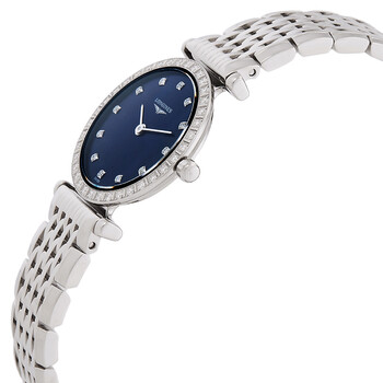Stainless steel case with a polished stainless steel bracelet. Fixed bezel. Blue dial with silver-tone hands and diamond hour markers. Dial Type: Analog. Quartz movement. Scratch resistant sapphire crystal. Pull / push crown. Solid case back. Round case shape, case size: 24 mm, case thickness: 5 mm. Band width: 13 mm. Hidden folding clasp. Water resistant at 30 meters / 99 feet. Functions: hour, minute. Additional Info: case set with 36 top wesselton if-vvs diamonds, for a total of 0.302 carats. La Grande Classique Series. Dress watch style. Watch label: Swiss Made. Longines La Grande Classique Quartz Diamond Blue Dial Ladies Watch L4.341.0.97.6.
