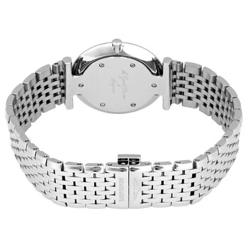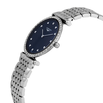 Stainless steel case with a stainless steel bracelet. Fixed stainless steel bezel set with 44 diamonds. Blue dial with silver-tone hands and diamond hour markers. Dial Type: Analog. Caliber L420 quartz movement. Scratch resistant sapphire crystal. Pull / push crown. Solid case back. Round case shape. Case size: 29 mm. Case thickness: 4.5 mm. Triple fold over clasp. Water resistant at 30 meters / 100 feet. Functions: hour, minute. La Grande Classique Series. Casual watch style. Watch label: Swiss Made. Longines La Grande Classique Quartz Diamond Blue Dial Ladies Watch L4.523.0.97.6.