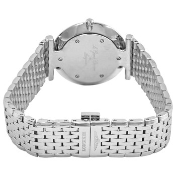 Stainless steel case with a stainless steel bracelet. Fixed stainless steel bezel set with 56 Wesselton diamonds. Mother of pearl dial with black hands and diamond hour markers. Dial Type: Analog. Longines calibre L420 quartz movement. Scratch resistant sapphire crystal. Pull / push crown. Solid case back. Round case shape. Case size: 29 mm. Case thickness: 4.5 mm. Band width: 14 mm. Fold over clasp with a push button release. Water resistant at 30 meters / 100 feet. Functions: hour, minute. La Grande Classique Series. Casual watch style. Watch label: Swiss Made. Item Variations: L4 513 0 87 6, L4-513-0-87-6, L4/513/0/87/6, L45130876. Longines La Grande Classique Quartz Diamond Ladies Watch L4.513.0.87.6.