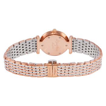 Rose gold PVD stainless steel case with a two-tone (silver-tone and rose gold PVD) stainless steel bracelet. Fixed rose gold PVD bezel. White dial with black hands and index hour markers. Dial Type: Analog. Quartz movement. Scratch resistant mineral crystal. Pull / push crown. Solid case back. Round case shape. Case size: 24 mm. Water resistant at 30 meters / 100 feet. Functions: hour, minute. La Grande Classique Series. Casual watch style. Watch label: Swiss Made. Longines La Grande Classique Quartz White Dial Ladies Watch L42091927.