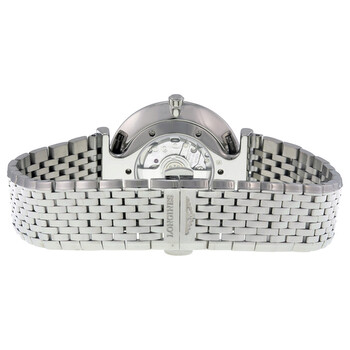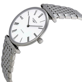 Stainless steel case with a stainless steel bracelet. Fixed stainless steel bezel. White dial with silver-tone hands and Roman numeral hour markers. Dial Type: Analog. Automatic movement. Scratch resistant sapphire crystal. Pull / push crown. Skeleton case back. Case diameter: 34 mm. Round case shape. Deployment with push button release clasp. Water resistant at 30 meters / 100 feet. Functions: hour, minute, second. Luxury watch style. Watch label: Swiss Made. Longines La Grande Classique Stainless Steel Men's Watch L4.708.4.11.6.