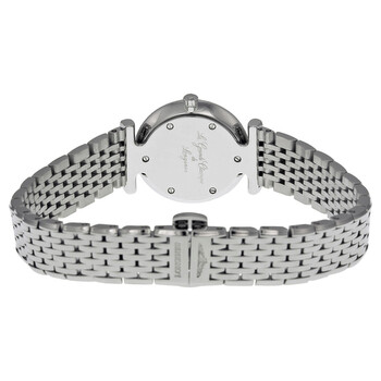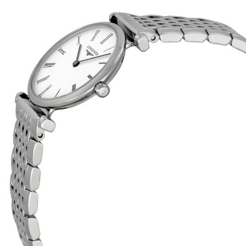Stainless steel case with a stainless steel bracelet. Fixed stainless steel bezel. White dial with black hands and Roman numeral hour markers. Dial Type: Analog. Quartz movement. Scratch resistant synthetic sapphire crystal. Pull / push crown. Solid case back. Case diameter: 23.5 mm. Case thickness: 6 mm. Round case shape. Band width: 17.8 mm. Band length: 7 inches. Fold over clasp. Water resistant at 30 meters / 100 feet. Functions: hours, minutes. Dress watch style. Watch label: Swiss. Longines La Grande Classique White Dial Stainless Steel Ladies Watch L42094116.