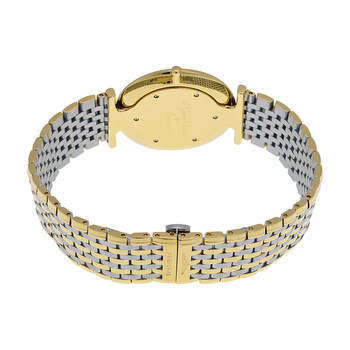 Gold PVD stainless steel case with a two-tone (silver and gold PVD) stainless steel bracelet. Fixed gold PVD bezel. White dial with black hands and Roman numeral hour markers. Dial Type: Analog. Longines calibre L420 quartz movement. Scratch resistant sapphire crystal. Pull / push crown. Solid case back. Case size: 36 mm. Case thickness: 5 mm. Round case shape. Fold over clasp with a push button release. Water resistant at 30 meters / 100 feet. Functions: hour, minute. Casual watch style. Watch label: Swiss. Longines La Grande Classique White Dial Two-tone Men's Watch L47552117.