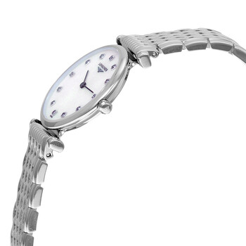 Stainless steel case with a stainless steel bracelet. Fixed stainless steel bezel. White mother of pearl dial with black hands and diamond hour markers. Dial Type: Analog. Quartz movement. Scratch resistant sapphire crystal. Pull / push crown. Solid case back. Case diameter: 33 mm. Case thickness: 5 mm. Round case shape. Band length: 7 inches. Deployment clasp with push button release. Water resistant at 30 meters / 100 feet. Functions: hour, minute. Additional Info: 12 diamonds on dial (.081ct). Dress watch style. Watch label: Swiss Made. Longines La Grande Classique White Mother of Pearl Dial Stainless Steel Ladies Watch L4.709.4.87.6.