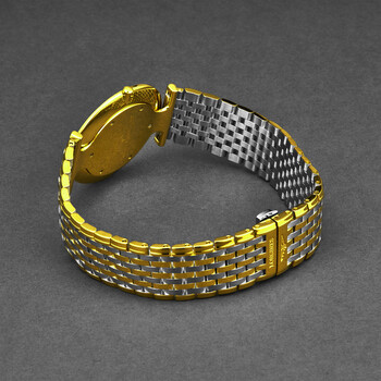 Yellow gold-tone stainless steel case with a two-tone stainless steel bracelet. Fixed yellow gold-tone stainless steel bezel. Gold-tone dial with black hands and index hour markers. Dial Type: Analog. Longines Calibre L420 quartz movement. Scratch resistant sapphire crystal. Round case shape, case size: 36 mm. Fold over clasp with a safety release. Water resistant at 30 meters / 100 feet. Functions: hour, minute. Additional Info: original box, international warranty card, manual (complete accessories). La Grande Series. Luxury watch style. Watch label: Swiss Made. Longines La Grande Quartz Gold Dial Unisex Watch L4.755.2.32.7.