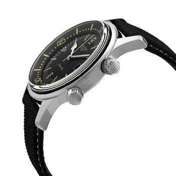 Stainless steel case with a black fabric (leather backed) strap. Bi-directional rotating stainless steel bezel. Black dial with luminous silver-tone hands and index hour markers. Roman numerals mark the 6, 9 and 12 o'clock positions. Minute markers. Dial Type: Analog. Luminescent hands and markers. Date display at the 3 o'clock position. Longines calibre L888 automatic movement, based upon ETA A31.L11, containing 21 Jewels, bitting at 25200 vph, and has a power reserve of approximately 64 hours. Scratch resistant sapphire crystal. Screw down crown. Solid case back. Round case shape. Case size: 42 mm. Band width: 22 mm. Tang clasp. Water resistant at 300 meters / 1000 feet. Functions: date, hour, minute, second. Legend Diver Series. Watch label: Swiss Made. Longines Legend Diver Automatic Black Dial Men's Watch L37744500.