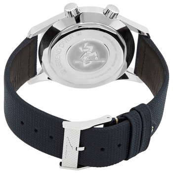 Silver-tone stainless steel case with a blue (calfskin) leather strap. Bi-directional rotating silver-tone stainless steel bezel. Blue lacquered dial with luminous silver-tone hands and index hour markers. Arabic numeral at 6, 9 and 12 o clock positions. Minute markers around the outer rim. Dial Type: Analog. Luminescent hands and markers. Date display at the 3 o'clock position. Longines Calibre L888 Automatic movement, based upon ETA A31.L11, containing 21 Jewels, bitting at 25200 vph, and has a power reserve of approximately 64 hours. Scratch resistant sapphire crystal. Screw down crown. Solid case back. Round case shape, case size: 42 mm, case thickness: 12.7 mm. Band width: 22 mm. Tang clasp. Water resistant at 300 meters / 1000 feet. Functions: date, hour, minute, second. Legend Diver Series. Dress watch style. Watch label: Swiss Made. Longines Legend Diver Automatic Blue Lacquered Dial Men's Watch L3.774.4.90.2.