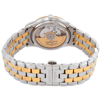 Stainless steel case with a two-tone (silver and 18kt gold-plated) stainless bracelet. Fixed 18kt gold-plated bezel. Gold dial with gold-tone hands and diamond hour markers. Dial Type: Analog. Date display at the 3 o'clock position. Longines calibre L619 automatic movement with a 42-hour power reserve. Scratch resistant sapphire crystal. Pull / push crown. Transparent case back. Case size: 35.6 mm. Round case shape. Fold over clasp. Water resistant at 30 meters / 100 feet. Functions: date, day, hour, minute, second. Casual watch style. Watch label: Swiss. Item Variations: L47743377. Longines Les Grandes Classiques Automatic Diamond Men's Watch L4.774.3.37.7.