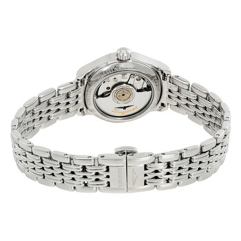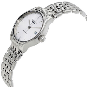 Stainless steel case with a stainless steel bracelet. Fixed stainless steel bezel. Silver dial with silver-tone hands and index hour markers. Minute markers around the outer rim. Dial Type: Analog. Date display at the 6 o'clock position. Automatic movement. Scratch resistant sapphire crystal. Pull / push crown. Transparent case back. Case size: 25 mm. Case thickness: 8 mm. Round case shape. Band width: 13 mm. Band length: 8 inches. Fold over clasp with a push button release. Water resistant at 30 meters / 100 feet. Functions: date, hour, minute, second. Dress watch style. Watch label: Swiss. Longines Lyre Automatic Silver Dial Ladies Watch L43604726.