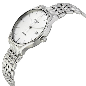 Stainless steel case with a stainless steel bracelet. Fixed stainless steel bezel. Silver dial with silver-tone hands and index hour markers. Minute markers around the outer rim. Dial Type: Analog. Date display at the 3 o'clock position. Automatic movement. Scratch resistant sapphire crystal. Pull / push crown. Transparent case back. Case size: 35 mm. Case thickness: 8 mm. Round case shape. Band width: 18 mm. Hidden fold over clasp. Water resistant at 30 meters / 100 feet. Functions: date, hour, minute, second. Luxury watch style. Longines Lyre Automatic Silver Dial Ladies Watch L48604726.