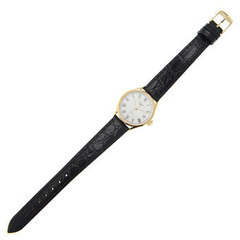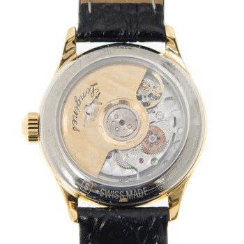 Yellow gold-tone stainless steel case with a black alligator band. Fixed yellow gold-tone stainless steel bezel. White dial with yellow gold-tone hands and Roman numeral hour markers. Minute markers around the outer rim. Dial Type: Analog. Date display at the 3 o'clock position. Longines Calibre L595 Automatic movement, based upon ETA 2000/1, containing 20 Jewels, bitting at 28800 vph, and has a power reserve of approximately 40 hours. Scratch resistant sapphire crystal. Transparent see through case back. Round case shape, case size: 25 mm, case thickness: 8 mm. Band width: 13 mm. Buckle clasp. Water resistant at 30 meters / 100 feet. Functions: date, hour, minute, second. Additional Info: original box, international warranty card, manual (complete accessories). Lyre Series. Luxury watch style. Watch label: Swiss Made. Longines Lyre Automatic White Dial Ladies Watch L4.360.2.11.2.
