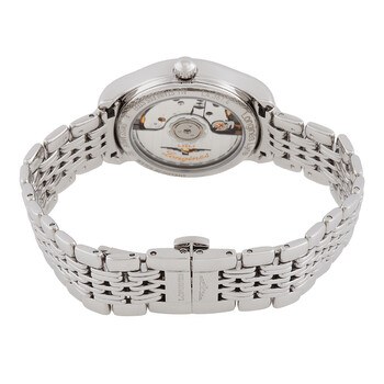 Silver-tone stainless steel case and bracelet. Fixed silver-tone stainless steel bezel. White dial with silver-tone hands and Roman numeral hour markers. Minute markers around the outer rim. Dial Type: Analog. Date display at the 3 o'clock position. Longines Calibre L888 Automatic movement, based upon ETA A31.L11, containing 21 Jewels, bitting at 25200 vph, and has a power reserve of approximately 64 hours. Scratch resistant sapphire crystal. Transparent see through case back. Round case shape, case size: 30 mm. Deployment with push button release clasp. Water resistant at 30 meters / 100 feet. Functions: date, hour, minute, second. Additional Info: original box, international warranty card, manual (complete accessories). Lyre Series. Luxury watch style. Watch label: Swiss Made. Longines Lyre Automatic White Dial Ladies Watch L4.361.4.11.6.