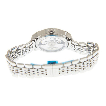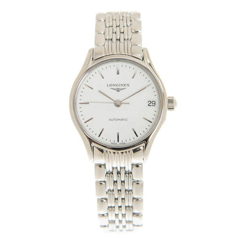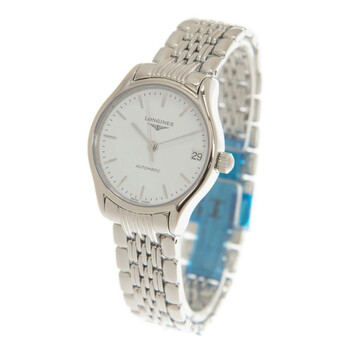Silver-tone stainless steel case and bracelet. Fixed silver-tone stainless steel bezel. White dial with silver-tone hands and index hour markers. Minute markers around the outer rim. Dial Type: Analog. Date display at the 3 o'clock position. Longines Calibre L888 Automatic movement, based upon ETA A31.L11, containing 21 Jewels, bitting at 25200 vph, and has a power reserve of approximately 64 hours. Scratch resistant sapphire crystal. Transparent see through case back. Round case shape, case size: 30 mm, case thickness: 8.5 mm. Deployment with push button release clasp. Water resistant at 30 meters / 100 feet. Functions: date, hour, minute, second. Additional Info: original box, international warranty card, manual (complete accessories). Lyre Series. Luxury watch style. Watch label: Swiss Made. Longines Lyre Automatic White Dial Ladies Watch L4.361.4.12.6.