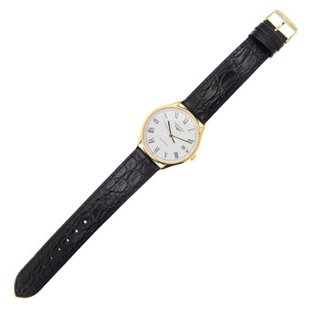 Yellow gold-tone stainless steel case with a black alligator band. Fixed yellow gold-tone stainless steel bezel. White dial with yellow gold-tone hands and Roman numeral hour markers. Minute markers around the outer rim. Dial Type: Analog. Date display at the 3 o'clock position. Longines Calibre L619 Automatic movement, based upon ETA 2892-A2, containing 21 Jewels, bitting at 28800 vph, and has a power reserve of approximately 42 hours. Scratch resistant sapphire crystal. Transparent see through case back. Round case shape, case size: 35 mm. Band width: 18 mm. Buckle clasp. Water resistant at 30 meters / 100 feet. Functions: date, hour, minute, second. Additional Info: original box, international warranty card, manual (complete accessories). Lyre Series. Luxury watch style. Watch label: Swiss Made. Longines Lyre Automatic White Dial Ladies Watch L4.860.2.11.2.