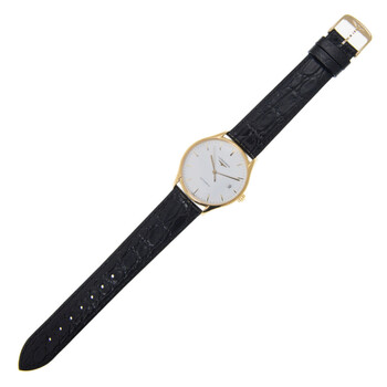 Yellow gold-tone stainless steel case with a black alligator band. Fixed yellow gold-tone stainless steel bezel. White dial with yellow gold-tone hands and index hour markers. Minute markers around the outer rim. Dial Type: Analog. Date display at the 3 o'clock position. Longines Calibre L619 Automatic movement, based upon ETA 2892-A2, containing 21 Jewels, bitting at 28800 vph, and has a power reserve of approximately 42 hours. Scratch resistant sapphire crystal. Transparent see through case back. Round case shape, case size: 35 mm. Band width: 18 mm. Buckle clasp. Water resistant at 30 meters / 100 feet. Functions: date, hour, minute, second. Additional Info: original box, international warranty card, manual (complete accessories). Lyre Series. Luxury watch style. Watch label: Swiss Made. Longines Lyre Automatic White Dial Ladies Watch L4.860.2.12.2.