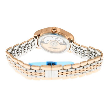 Rose gold-tone stainless steel case with a two-tone (silver-tone and rose gold-tone) stainless steel bracelet. Fixed rose gold-tone stainless steel bezel. White dial with rose gold-tone hands and Roman numeral hour markers. Minute markers around the outer rim. Dial Type: Analog. Date display at the 3 o'clock position. Automatic movement. Scratch resistant sapphire crystal. Transparent see through case back. Round case shape, case size: 30 mm. Deployment with push button release clasp. Functions: date, hour, minute, second. Additional Info: original box, international warranty card, manual (complete accessories). Lyre Series. Luxury watch style. Watch label: Swiss Made. Longines Lyre Automatic White Dial Ladies Watch L43611117.