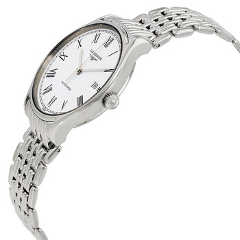 Stainless steel case with a stainless steel bracelet. Fixed stainless steel bezel. White dial with silver-tone hands and Roman numeral hour markers. Minute markers around an inner ring. Dial Type: Analog. Date display at the 3 o'clock position. Longines calibre L619 automatic movement, based upon ETA 2892-A2, containing 21 Jewels, bitting at 28800 vph, and has a power reserve of approximately 42 hours. Scratch resistant sapphire crystal. Pull / push crown. Transparent case back. Round case shape. Case size: 35 mm. Case thickness: 8 mm. Band width: 18 mm. Hidden fold over clasp. Water resistant at 30 meters / 100 feet. Functions: date, hour, minute, second. Lyre Series. Dress watch style. Watch label: Swiss Made. Longines Lyre Automatic White Dial Ladies Watch L48604116.