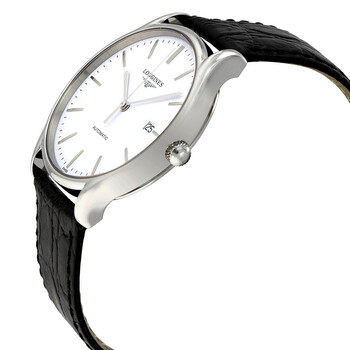 Stainless steel case with a black leather strap. Fixed stainless steel bezel. White dial with silver-tone hands and index hour markers. Minute markers around the outer rim. Dial Type: Analog. Date display at the 3 o'clock position. Longines calibre L619 automatic movement, based upon ETA 2892-A2, containing 21 Jewels, bitting at 28800 vph, and has a power reserve of approximately 42 hours. Scratch resistant sapphire crystal. Pull / push crown. Transparent case back. Round case shape. Case size: 39 mm. Band width: 20 mm. Tang clasp. Water resistant at 30 meters / 100 feet. Functions: date, hour, minute, second. Lyre Series. Casual watch style. Watch label: Swiss Made. Longines Lyre Automatic White Dial Men's Watch L4.960.4.12.2.