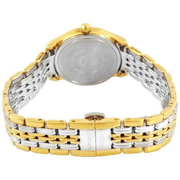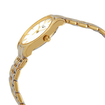 Yellow gold PVD stainless steel case with a two-tone (silver-tone and yellow gold PVD) stainless steel bracelet. Fixed yellow gold PVD bezel. White dial with yellow gold-tone hands and index hour markers. Minute markers around the outer rim. Dial Type: Analog. Date display at the 3 o'clock position. Longines calibre L152 quartz movement. Scratch resistant sapphire crystal. Pull / push crown. Solid case back. Round case shape. Case size: 25 mm. Case thickness: 5.10 mm. Band width: 13 mm. Fold over clasp with a push button release. Water resistant at 30 meters / 100 feet. Functions: date, hour, minute, second. Lyre Series. Luxury watch style. Watch label: Swiss Made. Item Variations: L 4 259 2 12 7, L 4-259-2-12-7, L 4/259/2/12/7, L 42592127. Longines Lyre Quartz White Dial Ladies Watch L 4.259.2.12.7.