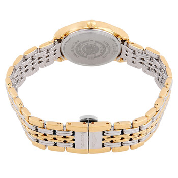 Silver-tone stainless steel case with a two-tone (silver-tone and yellow gold-tone) stainless steel bracelet. Fixed yellow gold-tone stainless steel bezel. White dial with yellow gold-tone hands and Roman numeral hour markers. Minute markers around the outer rim. Dial Type: Analog. Date display at the 3 o'clock position. Longines Calibre L152 quartz movement. Scratch resistant sapphire crystal. Round case shape, case size: 25 mm. Fold over clasp. Water resistant at 30 meters / 100 feet. Functions: date, hour, minute, second. Additional Info: original box, international warranty card, manual (complete accessories). Lyre Series. Luxury watch style. Watch label: Swiss Made. Longines Lyre Quartz White Dial Ladies Watch L4.259.2.11.7.