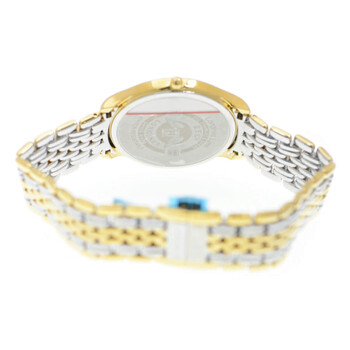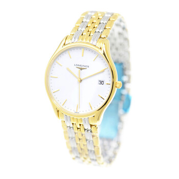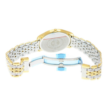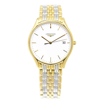 Yellow gold-tone stainless steel case with a two-tone (silver-tone and yellow gold-tone) stainless steel bracelet. Fixed yellow gold-tone stainless steel bezel. White dial with yellow gold-tone hands and index hour markers. Minute markers around the outer rim. Dial Type: Analog. Date display at the 3 o'clock position. Longines Calibre L157 quartz movement. Scratch resistant sapphire crystal. Solid case back. Round case shape, case size: 35 mm. Deployment with push button release clasp. Water resistant at 30 meters / 100 feet. Functions: date, hour, minute, second, battery eol indicator. Additional Info: original box, international warranty card, manual (complete accessories). Lyre Series. Luxury watch style. Watch label: Swiss Made. Longines Lyre Quartz White Dial Ladies Watch L4.759.2.12.7.