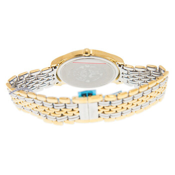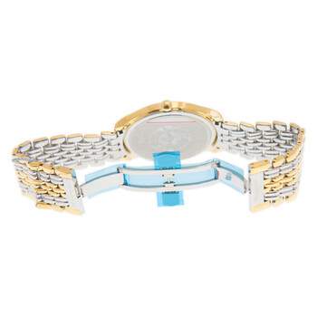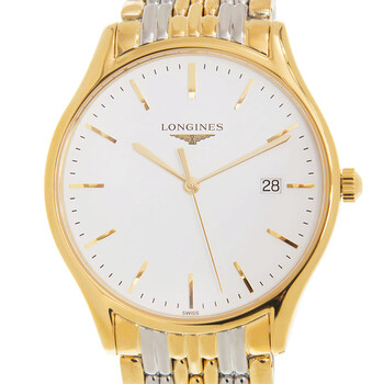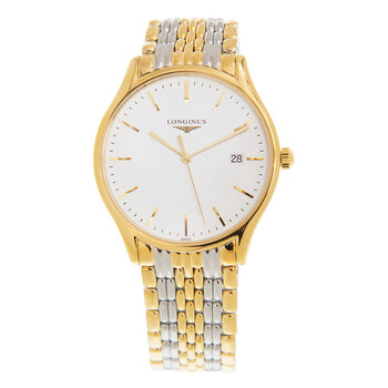 Yellow gold-tone stainless steel case with a two-tone (silver-tone and yellow gold-tone) stainless steel bracelet. Fixed yellow gold-tone stainless steel bezel. White dial with yellow gold-tone hands and index hour markers. Minute markers around the outer rim. Dial Type: Analog. Date display at the 3 o'clock position. Longines Calibre L157 quartz movement. Scratch resistant sapphire crystal. Solid case back. Round case shape, case size: 38.5 mm. Band width: 20 mm. Deployment with push button release clasp. Water resistant at 30 meters / 100 feet. Functions: date, hour, minute, second, battery eol indicator. Additional Info: original box, international warranty card, manual (complete accessories). Lyre Series. Luxury watch style. Watch label: Swiss Made. Longines Lyre Quartz White Dial Men's Watch L4.859.2.12.7.