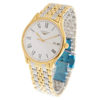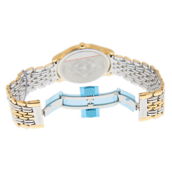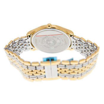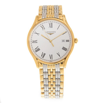 Gold-tone stainless steel case with a two-tone (silver-tone and gold-tone) stainless steel bracelet. Fixed gold-tone stainless steel bezel. White dial with gold-tone hands and Roman numeral hour markers. Minute markers around the outer rim. Dial Type: Analog. Date display at the 3 o'clock position. Longines Calibre L157 quartz movement. Scratch resistant sapphire crystal. Solid case back. Round case shape, case size: 38.5 mm. Band width: 20 mm. Deployment with push button release clasp. Water resistant at 30 meters / 100 feet. Functions: date, hour, minute, second, battery eol indicator. Additional Info: original box, international warranty card, manual (complete accessories). Lyre Series. Luxury watch style. Watch label: Swiss Made. Longines Lyre Quartz White Dial Unisex Watch L4.859.2.11.7.