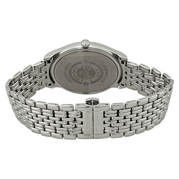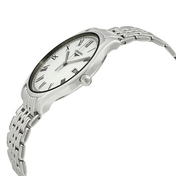 Silver-tone stainless steel case with a silver-tone stainless steel bracelet. Fixed silver-tone stainless steel bezel. White dial with polished silver-tone hands and Roman numeral hour markers. Dial Type: Analog. Date display at the 3 o'clock position. Longines Calibre L157 quartz movement. Scratch resistant sapphire crystal. Round case shape. Case size: 38.5 mm. Fold over with safety release clasp. Water resistant at 30 meters / 100 feet. Functions: date, hour, minute, second. Casual watch style. Watch label: Swiss Made. Longines Lyre White Dial Men's Watch L4.859.4.11.6.