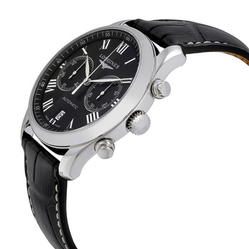 Stainless steel case with a black (alligator) leather strap. Fixed stainless steel bezel. Black dial with luminous silver-tone hands and Roman numeral hour markers. Minute markers around the outer rim. Dial Type: Analog. Luminescent hands and markers. Date display at the 6 o'clock position. Chronograph - two sub-dials displaying: 60 second and 30 minute. Longines calibre L651 automatic movement with a 42-hour power reserve. Scratch resistant sapphire crystal. Transparent case back. Case size: 40 mm. Case thickness: 9.5 mm. Round case shape. Deployment clasp. Water resistant at 30 meters / 100 feet. Functions: chronograph, date, hour, minute, second. Luxury watch style. Watch label: Swiss Made. Longines Master Automatic Chronograph Black Dial Men's Watch L26294517.