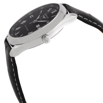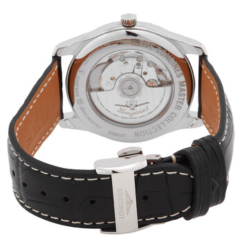 Stainless steel case with a black (alligator) leather strap. Fixed stainless steel bezel. Black dial with silver-tone hands and Roman numeral hour markers. Arabic numeral minute markers (at 5 minute intervals). Minute markers around the outer rim. Dial Type: Analog. Day of the week and date display at the 3 o'clock position. Longines calibre L897 automatic movement, based upon ETA A31.L81, containing 21 Jewels, bitting at 25200 vph, and has a power reserve of approximately 64 hours. Scratch resistant sapphire crystal. Screw down crown. Transparent case back. Round case shape. Case size: 40 mm. Case thickness: 9.5 mm. Deployment clasp. Water resistant at 30 meters / 100 feet. Functions: annual calendar, month, date, hour, minute, second, chronometer. Master Series. Luxury watch style. Watch label: Swiss Made. Longines Master Automatic Chronometer Annual Calendar Black Dial Men's Watch L2.910.4.51.7.