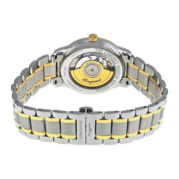 Stainless steel case with a stainless steel bracelet and 18kt yellow gold (cap) links. Fixed 18kt yellow gold (cap) bezel. Champagne dial with yellow gold leaf-style hands and diamond hour markers. Minute markers around the outer rim. Dial Type: Analog. Date display at the 6 o'clock position. Longines calibre L619 automatic movement, based upon ETA 2892-A2, containing 21 Jewels, bitting at 28800 vph, and has a power reserve of approximately 42 hours. Scratch resistant sapphire crystal. Pull / push crown. Transparent case back. Round case shape. Case size: 38.5 mm. Case thickness: 9.5 mm. Band width: 20 mm. Fold over clasp. Water resistant at 30 meters / 100 feet. Functions: date, hour, minute, second. Master Series. Luxury watch style. Watch label: Swiss Made. Item Variations: L26285377. Longines Master Automatic Diamond Champagne Dial Men's Watch L2.628.5.37.7.