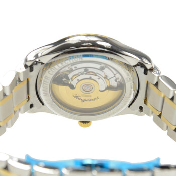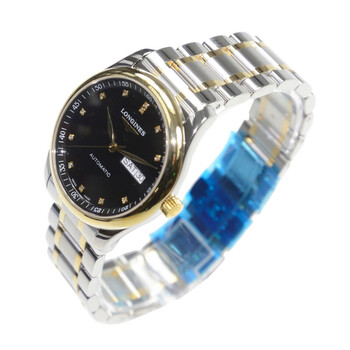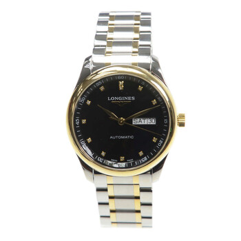 18kt yellow gold case with a two-tone (gold-tone and silver-tone) stainless steel and 18kt yellow gold bracelet. Fixed gold-tone bezel. Black dial with gold-tone hands and diamond hour markers. Minute markers around the outer rim. Dial Type: Analog. Day of the week and date display at the 3 o'clock position. Longines Calibre L636 automatic movement with a 38-hour power reserve. Scratch resistant sapphire crystal. Transparent case back. Case size: 38.5 mm. Case thickness: 9.5 mm. Round case shape. Band width: 20 mm. Push button folding clasp. Water resistant at 30 meters / 100 feet. Functions: date, day, hour, minute, second. Dress watch style. Watch label: Swiss Made. Longines Master Automatic Diamond Men's Watch L2.755.5.57.7.