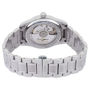 Silver-tone stainless steel case and bracelet. Fixed silver-tone stainless steel bezel. Orange dial with silver-tone hands and diamond hour markers. Minute markers around the outer rim. Dial Type: Analog. Date display at 3 o'clock position. Longines Calibre L888 Automatic movement, based upon ETA A31.L11, containing 21 Jewels, bitting at 25200 vph, and has a power reserve of approximately 64 hours. Scratch resistant sapphire crystal. Pull / push crown. Transparent case back. Round case shape, case size: 34 mm, case thickness: 9.2 mm. Band width: 18 mm. Fold over clasp with a safety release. Water resistant at 30 meters / 100 feet. Functions: date, hour, minute, second. Master Series. Dress watch style. Watch label: Swiss Made. Longines Master Automatic Diamond Orange Dial Ladies Watch L2.357.4.08.6.
