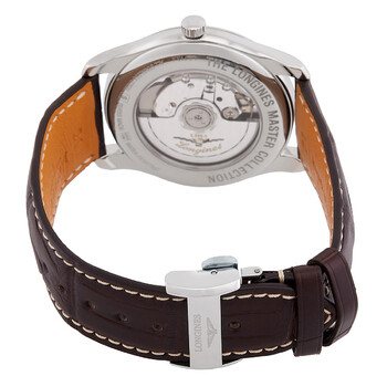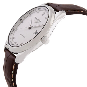 Silver-tone stainless steel case with a brown alligator leather strap. Fixed silver-tone stainless steel bezel. Silver "barleycorn" dial with silver-tone hands and diamond hour markers. Minute markers around the outer rim. Dial Type: Analog. Date display at the 3 o'clock position. Longines Calibre L888 Automatic movement, based upon ETA A31.L11, containing 21 Jewels, bitting at 25200 vph, and has a power reserve of approximately 64 hours. Scratch resistant sapphire crystal. Transparent see through case back. Round case shape, case size: 40 mm, case thickness: 9.35 mm. Band width: 21 mm. Folding clasp. Water resistant at 30 meters / 100 feet. Functions: date, hour, minute, second. Additional Info: dial set with 13 top wesselton vs-si diamonds, for a total of 0.059 carats. Master Series. Sport watch style. Watch label: Swiss Made. Longines Master Automatic Diamond Silver Dial Men's Watch L2.793.4.77.3.