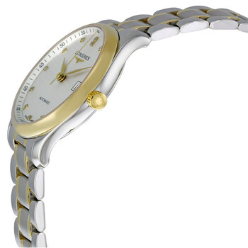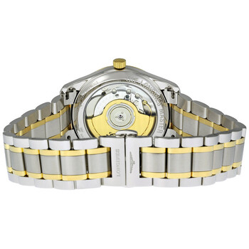 Stainless steel case with a stainless steel bracelet with 18kt yellow gold links. Fixed 18kt yellow gold bezel. White dial with gold-tone hands and diamond hour markers. Minute markers around the outer rim. Date display at the 3 o'clock position. Automatic movement. Scratch resistant sapphire crystal. Push / pull crown. Skeleton case back. Case diameter: 36 mm. Case thickness: 9 mm. Fold over clasp with push button release. Water resistant at 30 meters / 100 feet. Functions: hours, minutes, seconds, date. Longines Master Automatic Men's Watch 25185777