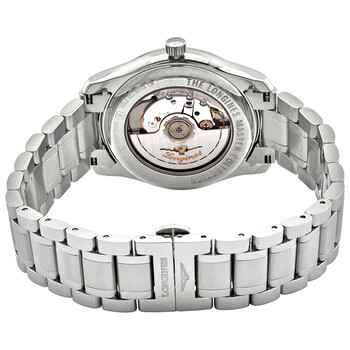 Stainless steel case with a stainless steel bracelet. Fixed stainless steel bezel. Silver dial with blue leaf-style shape hands and Arabic numeral hour markers. Arabic numeral minute markers (at 5 minute intervals). Minute markers around the outer rim. Dial Type: Analog. Date display at the 6 o'clock position. Combination date / moonphase sub-dial. Longines calibre L899 automatic movement, based upon ETA A31.L91, containing 21 Jewels, bitting at 25200 vph, and has a power reserve of approximately 64 hours. Scratch resistant sapphire crystal. Push / pull crown. Transparent case back. Round case shape. Case size: 40 mm. Band width: 21 mm. Hidden fold over clasp. Water resistant at 30 meters / 100 feet. Functions: date, hour, minute, second, moonphase. Master Series. Dress watch style. Watch label: Swiss Made. Longines Master Automatic Silver Dial Men's Watch L29094786.
