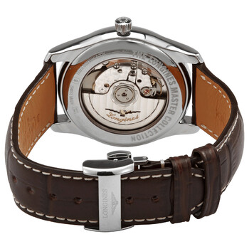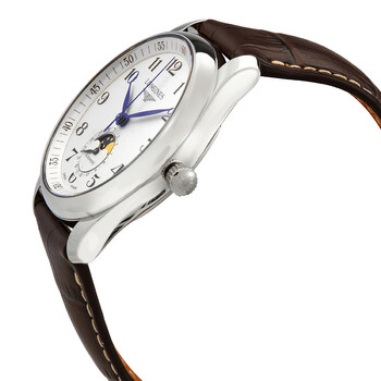 Stainless steel case with a brown leather strap. Fixed stainless steel bezel. White dial with blue hands and Arabic numeral hour markers. Arabic numeral minute markers (at 5 minute intervals). Minute markers around the outer rim. Dial Type: Analog. Date display at the 6 o'clock position. Combination date / moonphase sub-dial. Automatic movement with a 72-hour power reserve. Scratch resistant sapphire crystal. Pull / push crown. Transparent case back. Round case shape. Case size: 40 mm. Case thickness: 11.1 mm. Band width: 20 mm. Deployment clasp with a push button release. Water resistant at 30 meters / 100 feet. Functions: date, hour, minute, second, moonphase. Master Series. Dress watch style. Watch label: Swiss Made. Longines Master Automatic Moonphase White Dial Men's Watch L2.909.4.78.1.