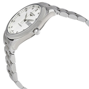 Stainless steel case with a silver-tone stainless steel bracelet. Fixed stainless steel bezel. Silver dial with silver-tone hands and diamond hour markers. Arabic numeral minute markers (at 5 minute intervals). Minute markers around the outer rim. Dial Type: Analog. Day of the week and date display at the 3 o'clock position. Longines calibre L636 automatic movement with a 38-hour power reserve. Scratch resistant sapphire crystal. Pull / push crown. Exhibition case back. Case size: 38.50 mm. Case thickness: 9.5 mm. Round case shape. Bracelet width: 20 mm. Deployment clasp. Water resistant at 30 meters / 100 feet. Functions: date, day, hour, minute, second. Additional Info: dial set with 12 diamonds (0.055 carats). Luxury watch style. Watch label: Swiss Made. Longines Master Automatic Silver Dial Men's Watch L2.755.4.77.6.