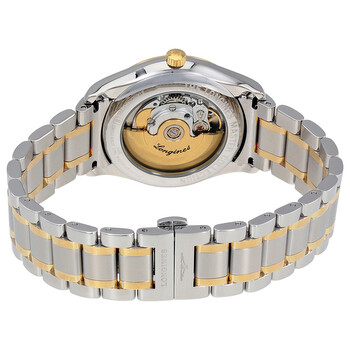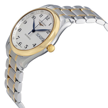 Stainless steel case with a stainless steel bracelet with 18kt yellow gold links. Fixed 18kt yellow gold bezel. Silver dial with blue hands and Arabic numeral hour markers. Arabic numeral minute markers (at 5 minute intervals). Minute markers around the outer rim. Dial Type: Analog. Day of the week and date display at the 3 o' clock position. Longines calibre L636 automatic movement, based upon ETA 2836, containing 25 Jewels, and has a power reserve of approximately 38 hours. Scratch resistant sapphire crystal. Pull / push crown. Transparent case back. Round case shape. Case size: 38.5 mm. Case thickness: 9.5 mm. Band width: 20 mm. Fold over clasp with a push button release. Water resistant at 30 meters / 100 feet. Functions: date, day, hour, minute, second. Master Series. Luxury watch style. Watch label: Swiss Made. Longines Master Automatic Silver Dial Men's Watch L2.755.5.78.7.