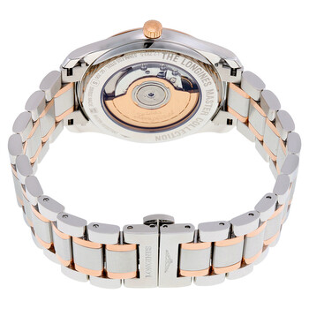 Silver-tone stainless steel case with a two-tone (silver-tone and rose gold-tone) stainless steel and 18kt rose gold bracelet. Fixed domed 18kt rose gold bezel. Silver dial with blue leaf-style shape hands and black Arabic numeral hour markers. Minute markers around the outer rim. Dial Type: Analog. Date display at the 3 o'clock position. Longines Calibre L619/888 Automatic movement, based upon ETA 2892, containing 21 Jewels, bitting at 25200 vph, and has a power reserve of approximately 64 hours. Scratch resistant sapphire crystal. Pull / push crown. Skeleton case back. Round case shape, case size: 40 mm, case thickness: 9.5 mm. Band width: 20 mm. Deployment clasp. Water resistant at 30 meters / 100 feet. Functions: date, hour, minute, second. Master Series. Luxury watch style. Watch label: Swiss Made. Item Variations: L27935797. Longines Master Automatic Silver Dial Men's Watch L2.793.5.79.7.